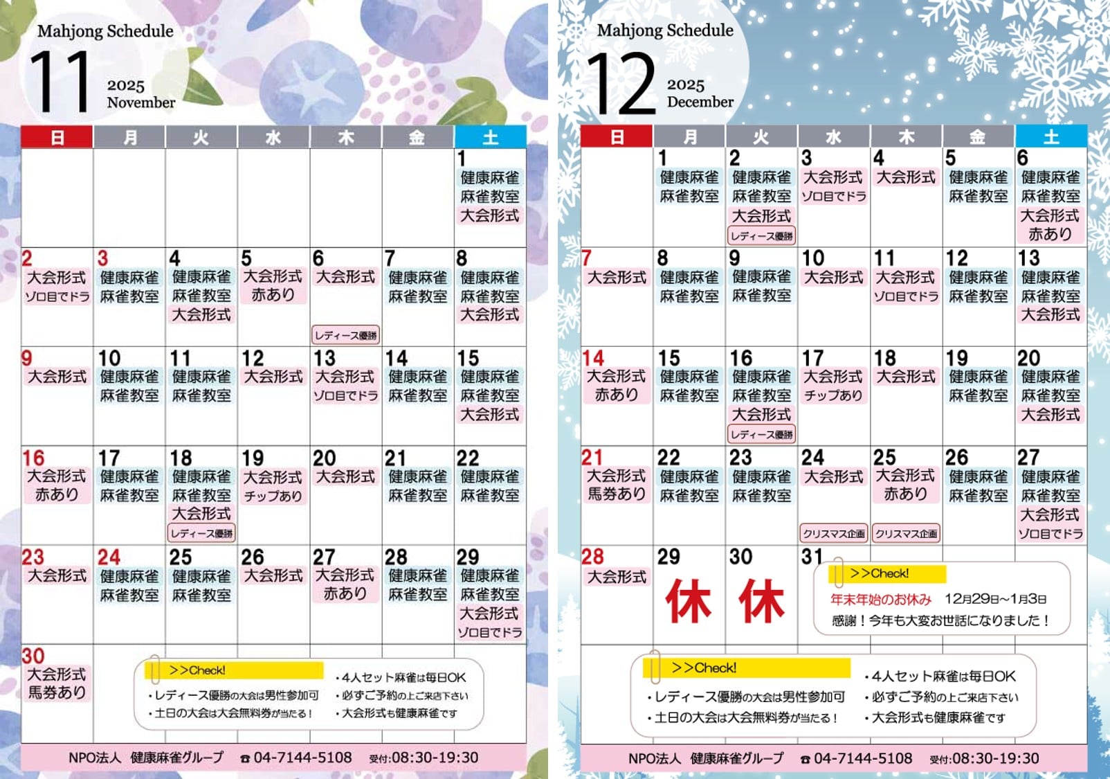 ※大会形式健康麻雀(火水木土日)に関しては必ず10時スタートです。ご予約は9時頃までにお願いいたします。